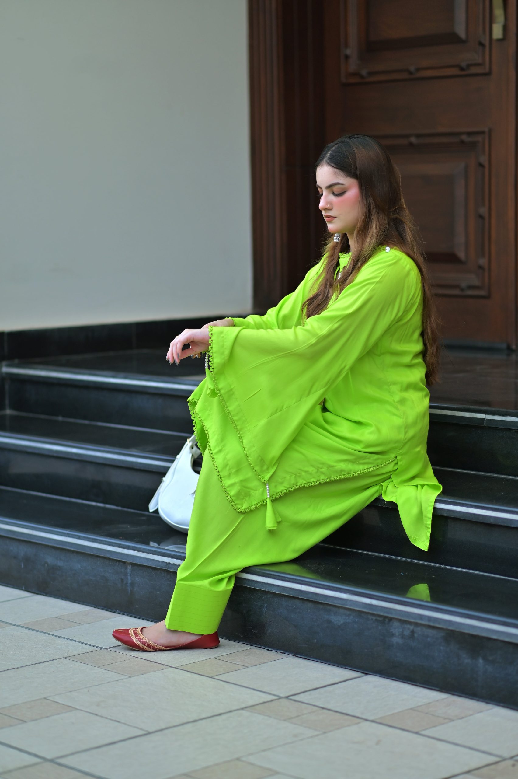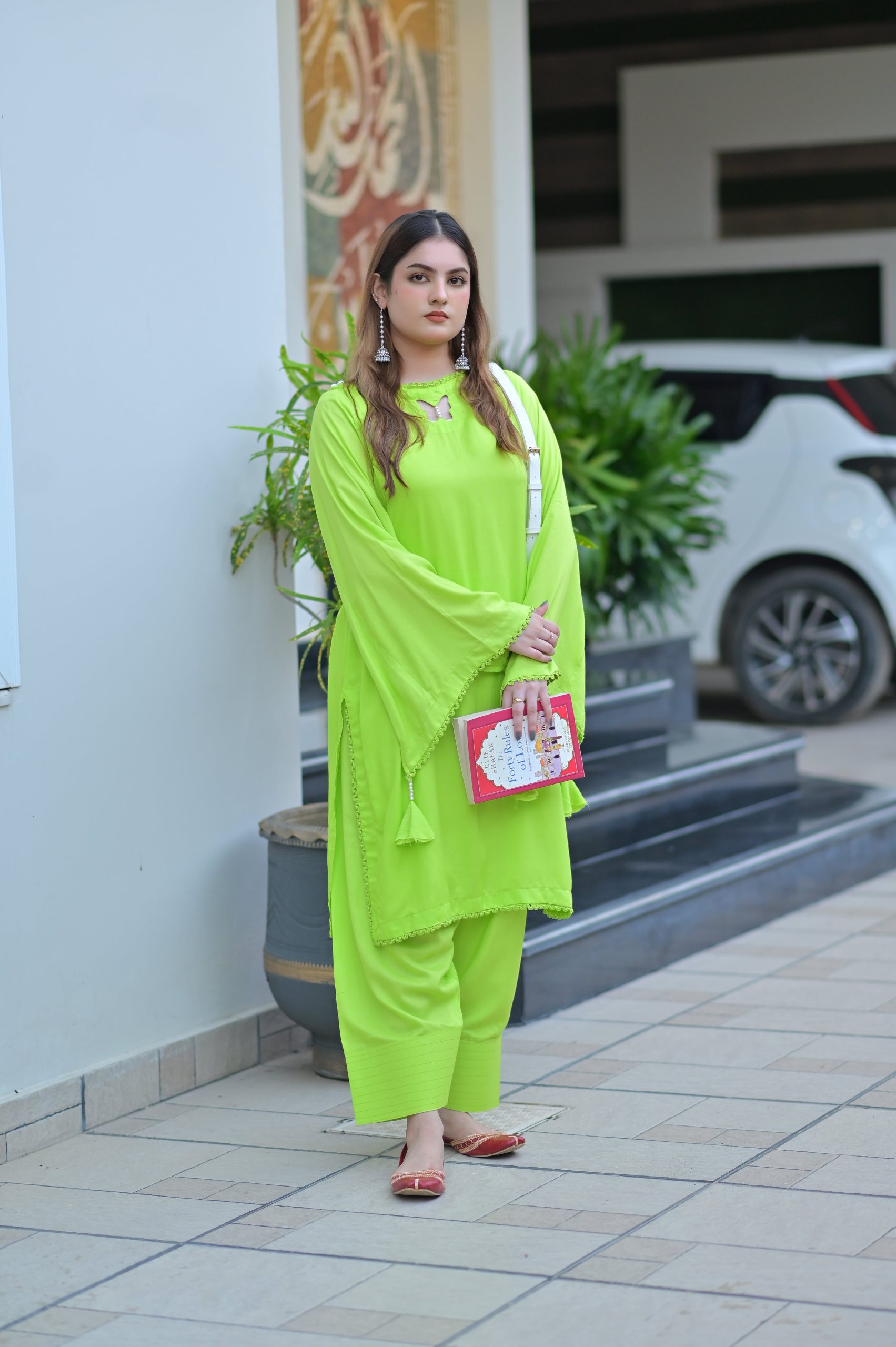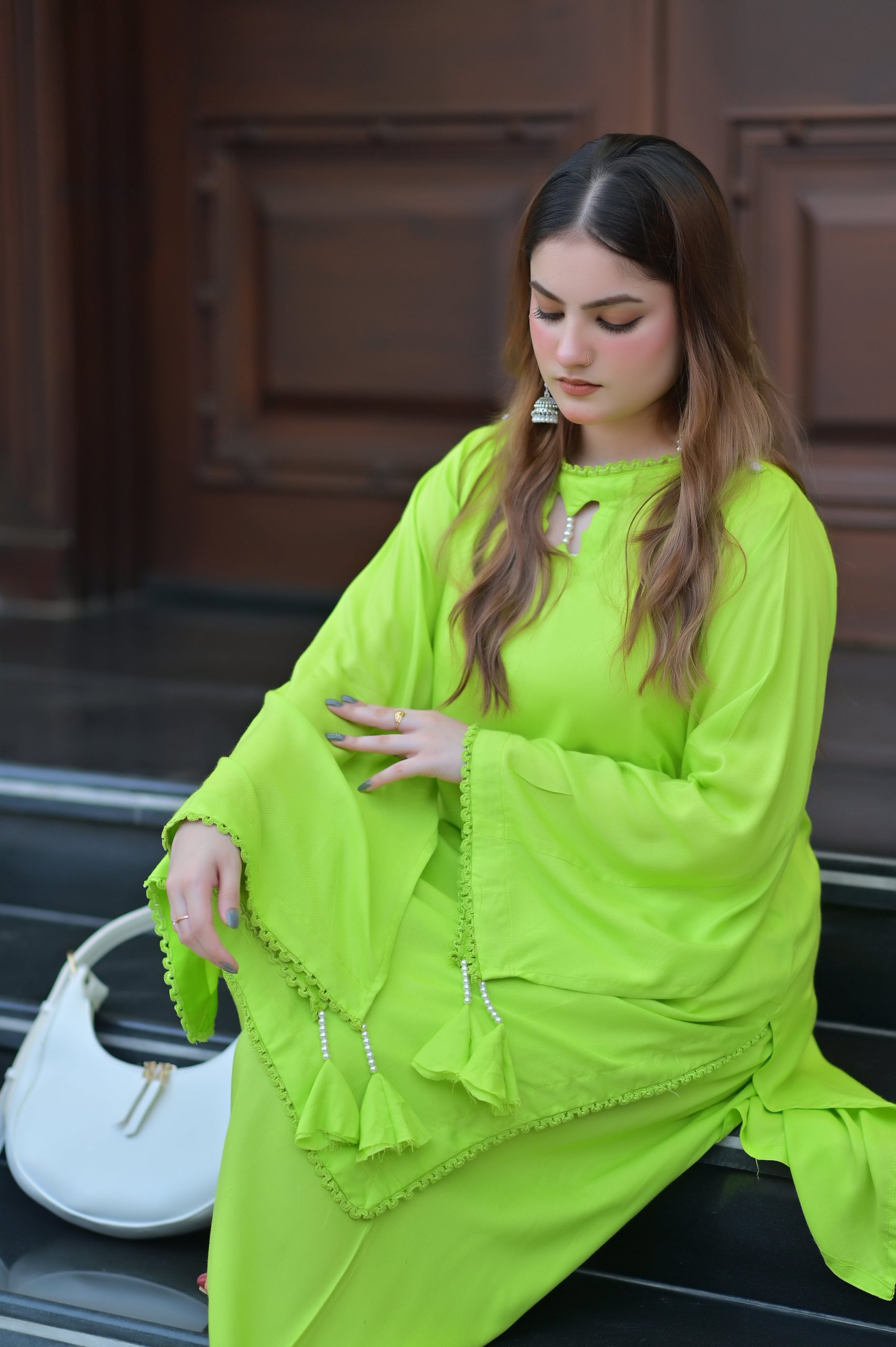 A vibrant parrot green linen set with a playful butterfly cut-out neckline. Finished with tassel details on sleeves and sides, it’s breezy, chic, and full of energy.