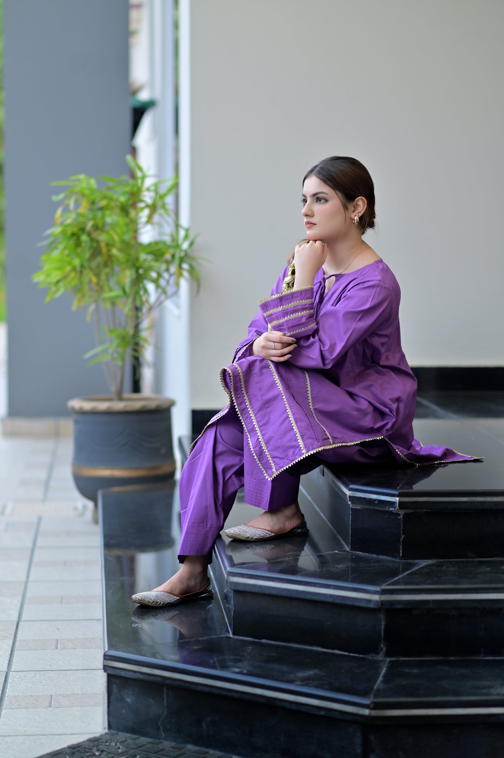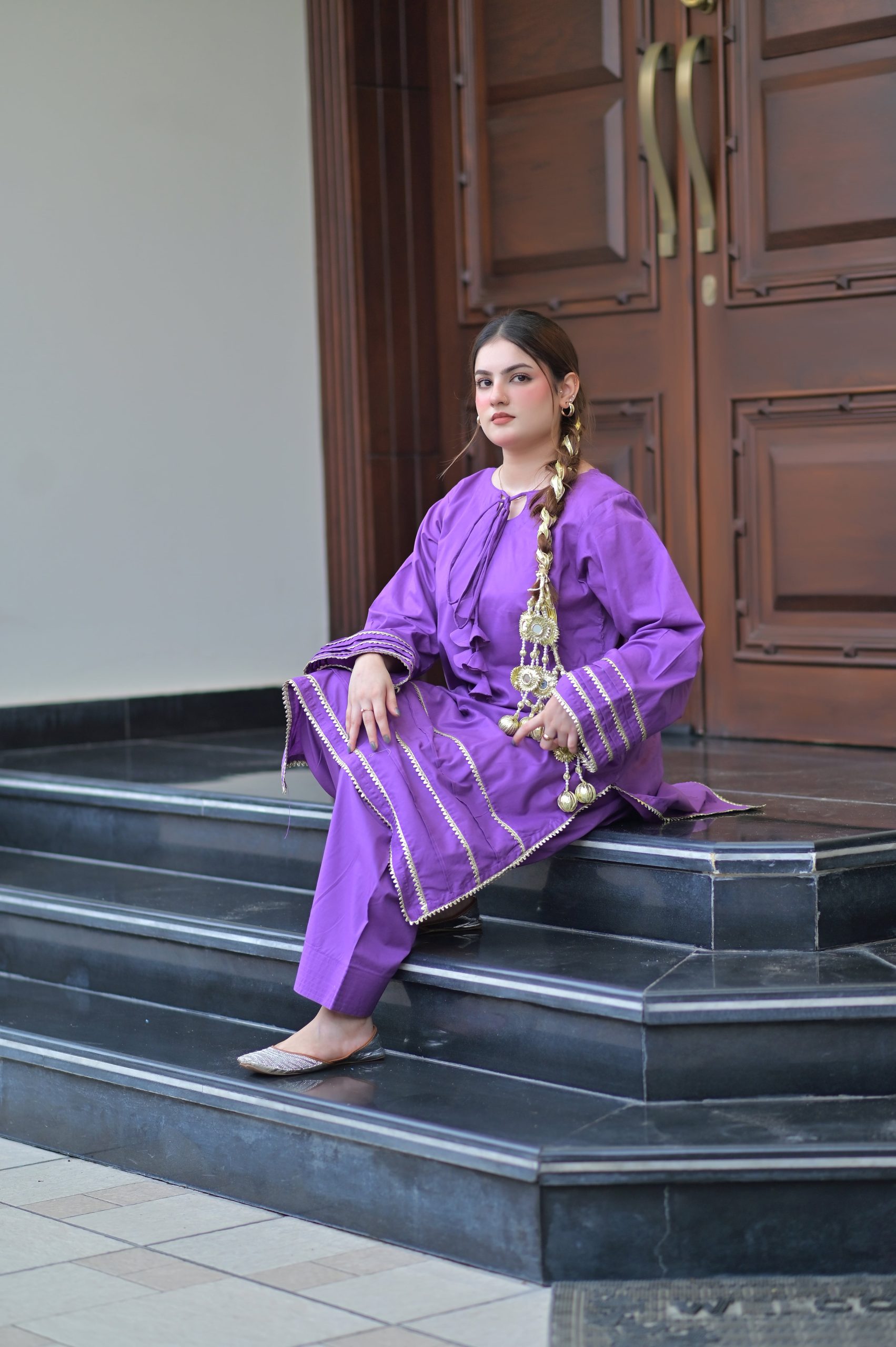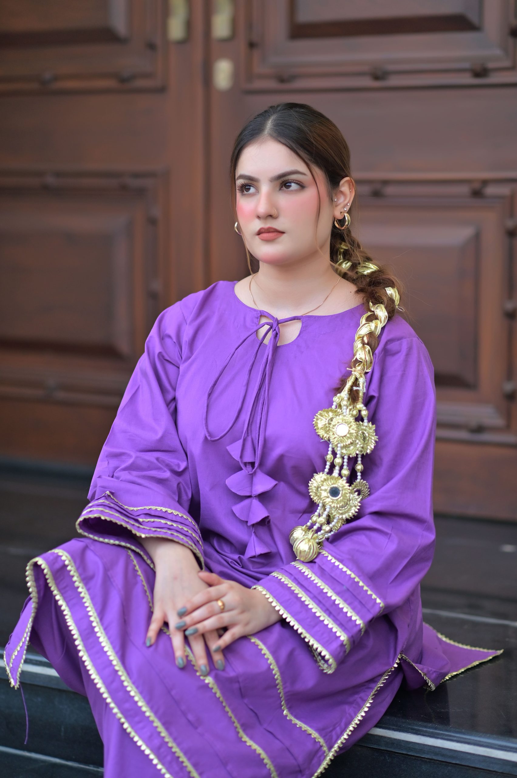 A radiant purple linen set, detailed with tassels and golden lace accents on the sleeves and hem. Its effortless cut and graceful finish create a look that glows with elegance and charm.